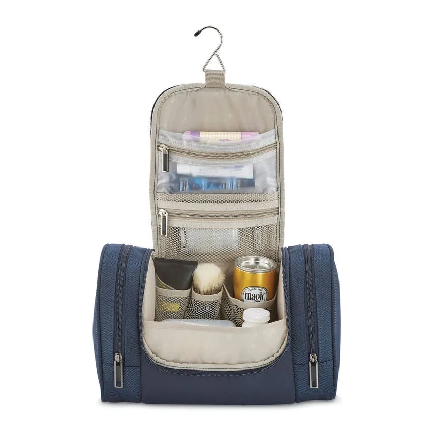 Il kit da viaggio appeso NuRoad è un kit da toilette perfetto che fa risparmiare spazio sul ripiano grazie al gancio in metallo per appenderlo e alle tasche aggiuntive per riporre gli oggetti.