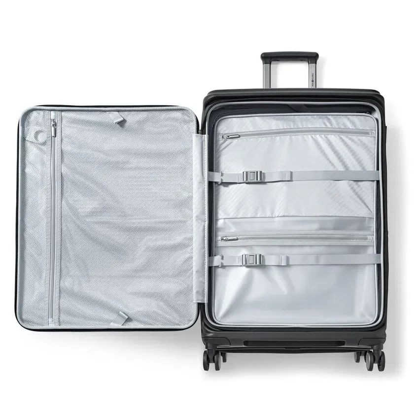 realizzato con materiali ultra resistenti e sostenibili, il trolley grande si apre al centro, come le valigie tradizionali, e dispone di una seconda apertura frontale che consente di caricare e scaricare completamente il contenuto quando lo spazio a terra è limitato.