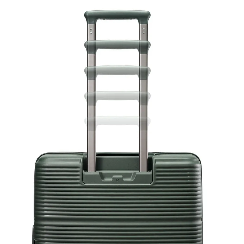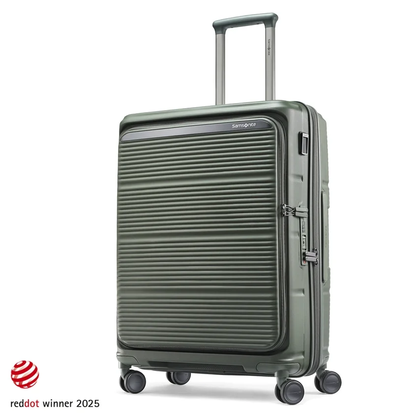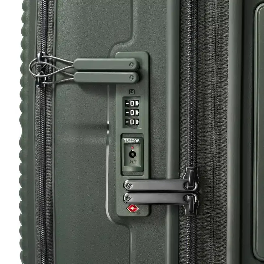 Realizzato con materiali ultra resistenti e sostenibili, il trolley medio si apre dal centro, come le valigie tradizionali, e dispone di una seconda apertura frontale che consente di caricare e scaricare completamente il contenuto quando lo spazio a terra è limitato.