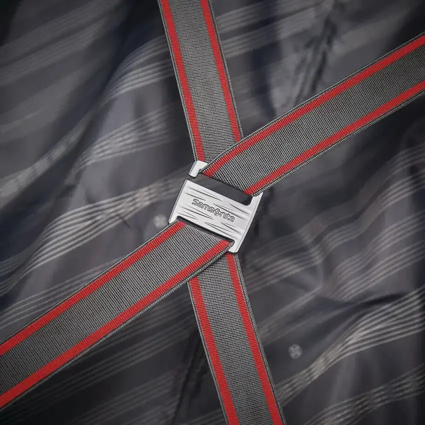 spaziosi scomparti con cinghie elastiche incrociate progettate su misura con un tocco di colore in tinta con l’esterno e pannello divisorio con cerniera