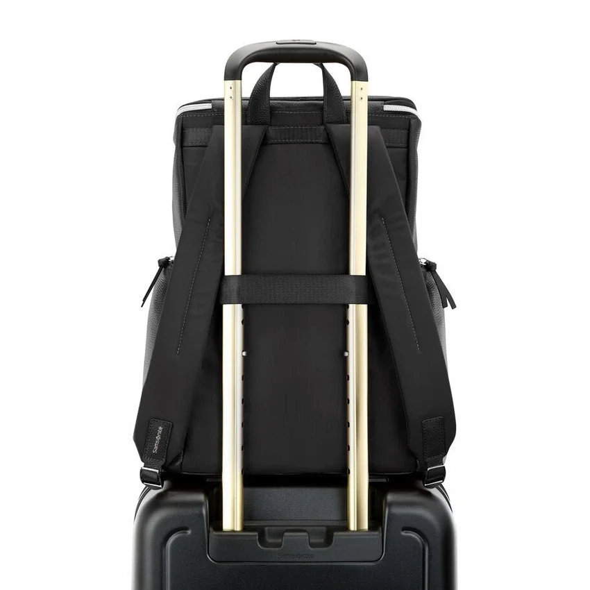 lo zaino deluxe in pelle è dotato di scomparti imbottiti per laptop e tablet, una spaziosa tasca frontale, due tasche laterali con cerniera per la bottiglia d’acqua o l’ombrello e comodi spallacci. la cinghia stackit™ integrata rende più agevoli gli spostamenti quotidiani e i viaggi.