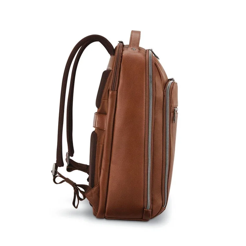 Viaggia con stile con uno zaino porta PC in pelle Samsonite, progettato per garantire comfort, protezione e spazio per due laptop, documenti e oggetti di uso quotidiano.